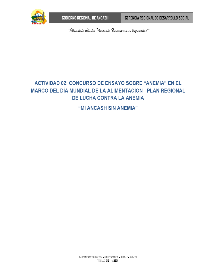 CONCURSO DE ENSAYO SOBRE “ANEMIA” EN EL MARCO DEL DÍA MUNDIAL DE LA ALIMENTACION - PLAN REGIONAL DE LUCHA CONTRA LA ANEMIA “MI ANCASH SIN ANEMIA”
